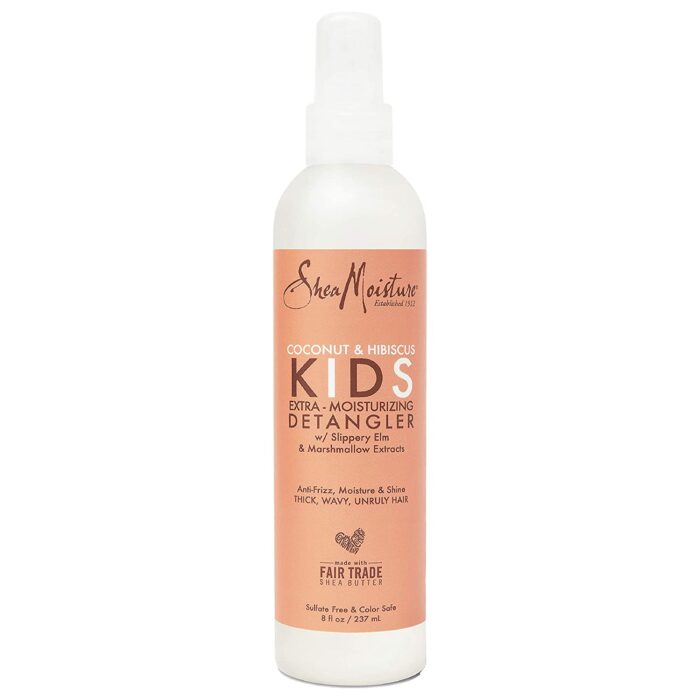 - SheaMoisture Coconut & Hibiscus Kids Extra Moisturizing Detangler adds volume to hair and moisturizes it from roots to ends, giving those kiddie curls extra bounce.